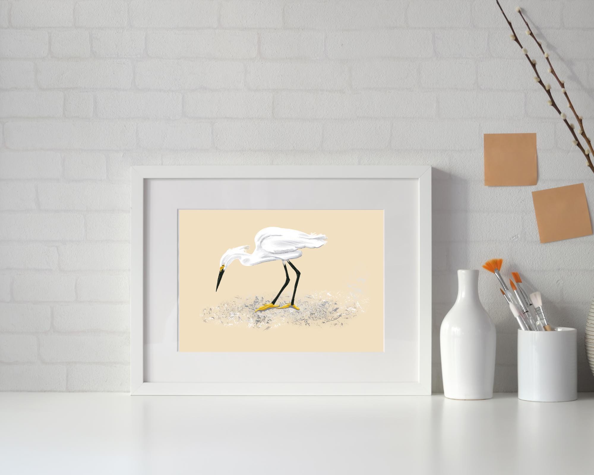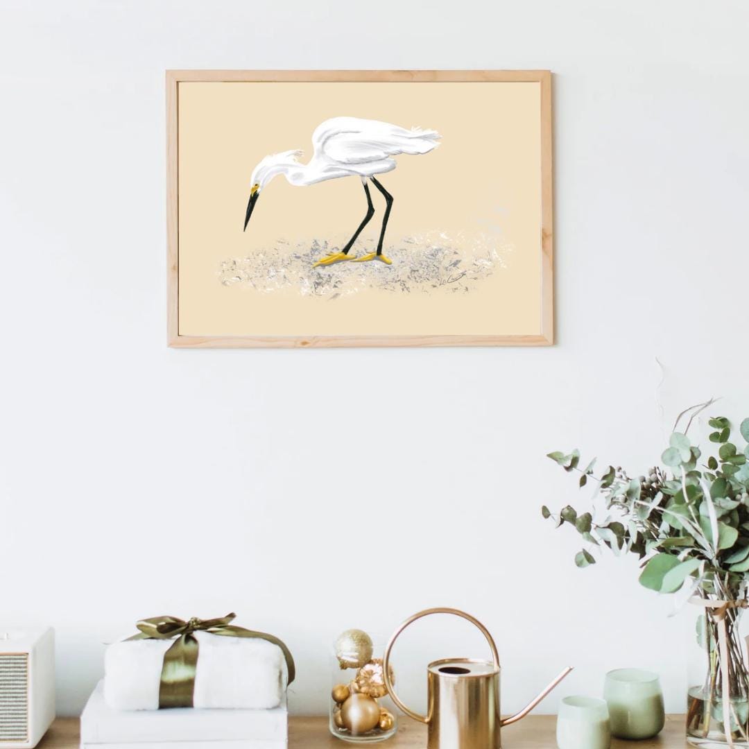 Bring the serene beauty of nature into your space with this unframed print of a stunning snowy egret feeding. The delicate white border elegantly sets off the intricate details of the painting. Choose from three size options to perfectly fit your decor. Transform your room into a peaceful sanctuary with this graceful artwork.