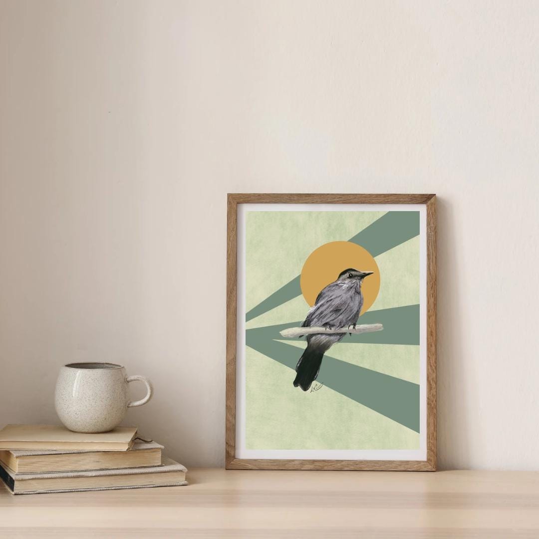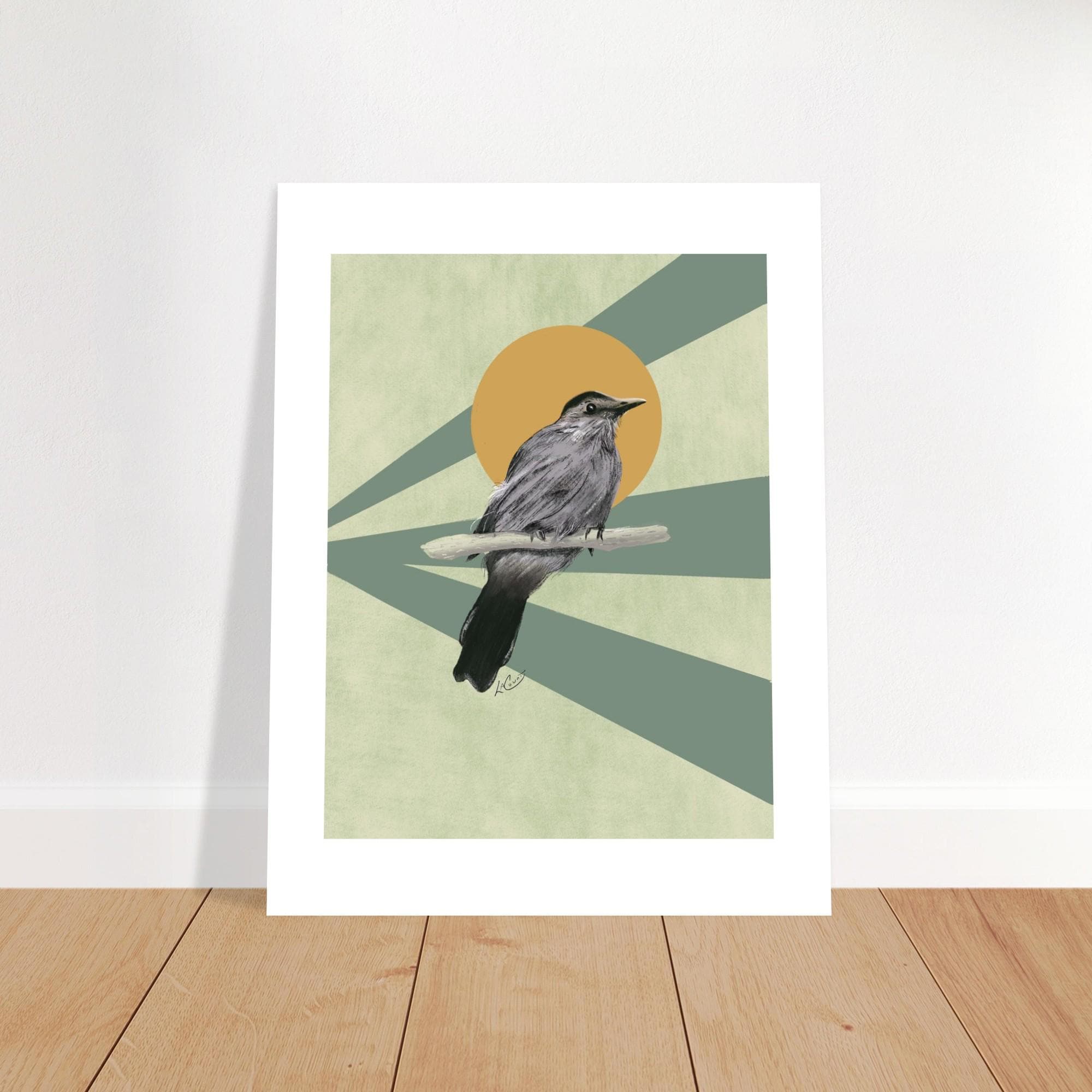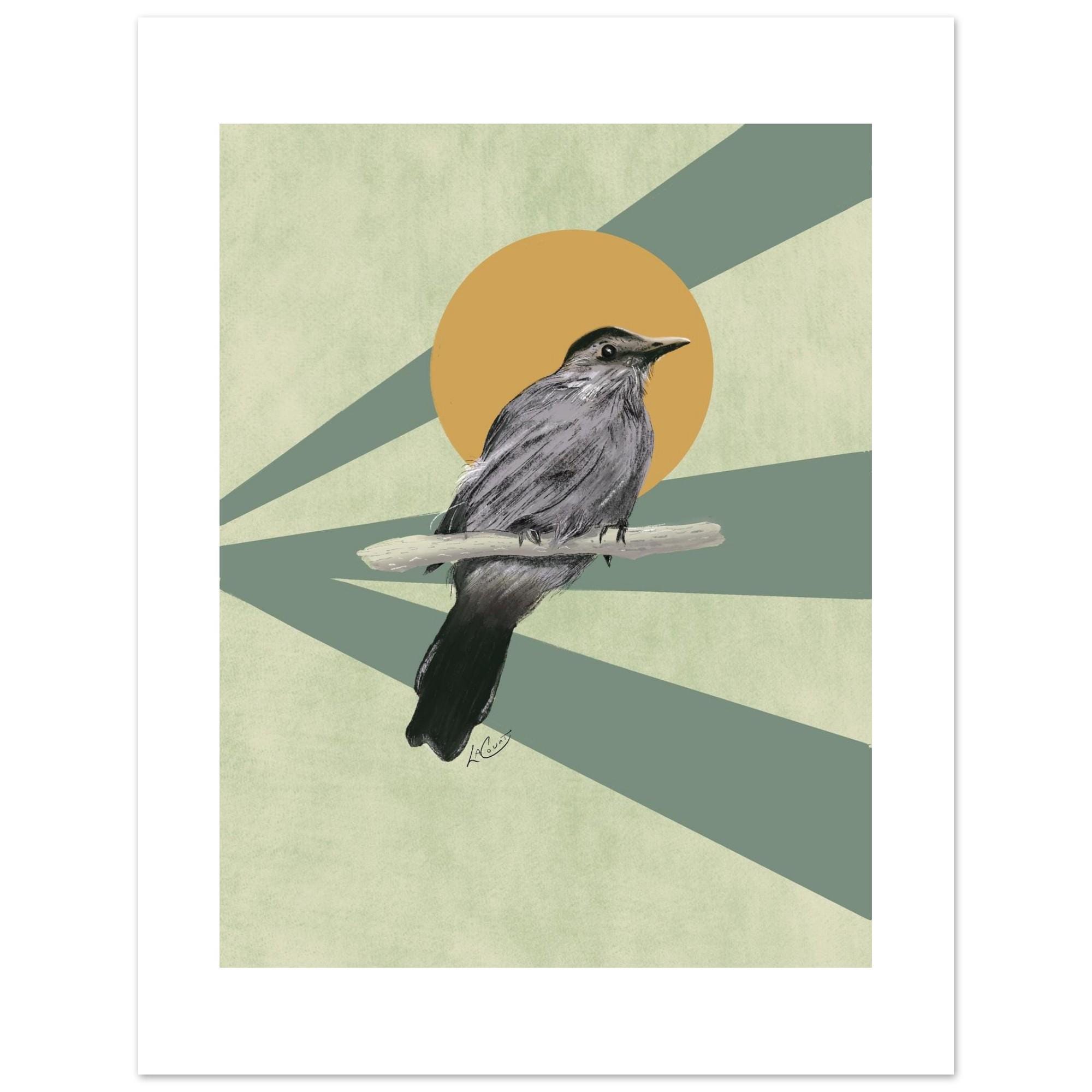 Elevate your space with this unframed print of a majestic Gray Catbird on a stunning green abstract backdrop. The white border adds a clean, modern touch, perfect for fitting into any frame effortlessly. Bring the beauty of nature into your home with this charming piece. Wildly elegant and versatile!