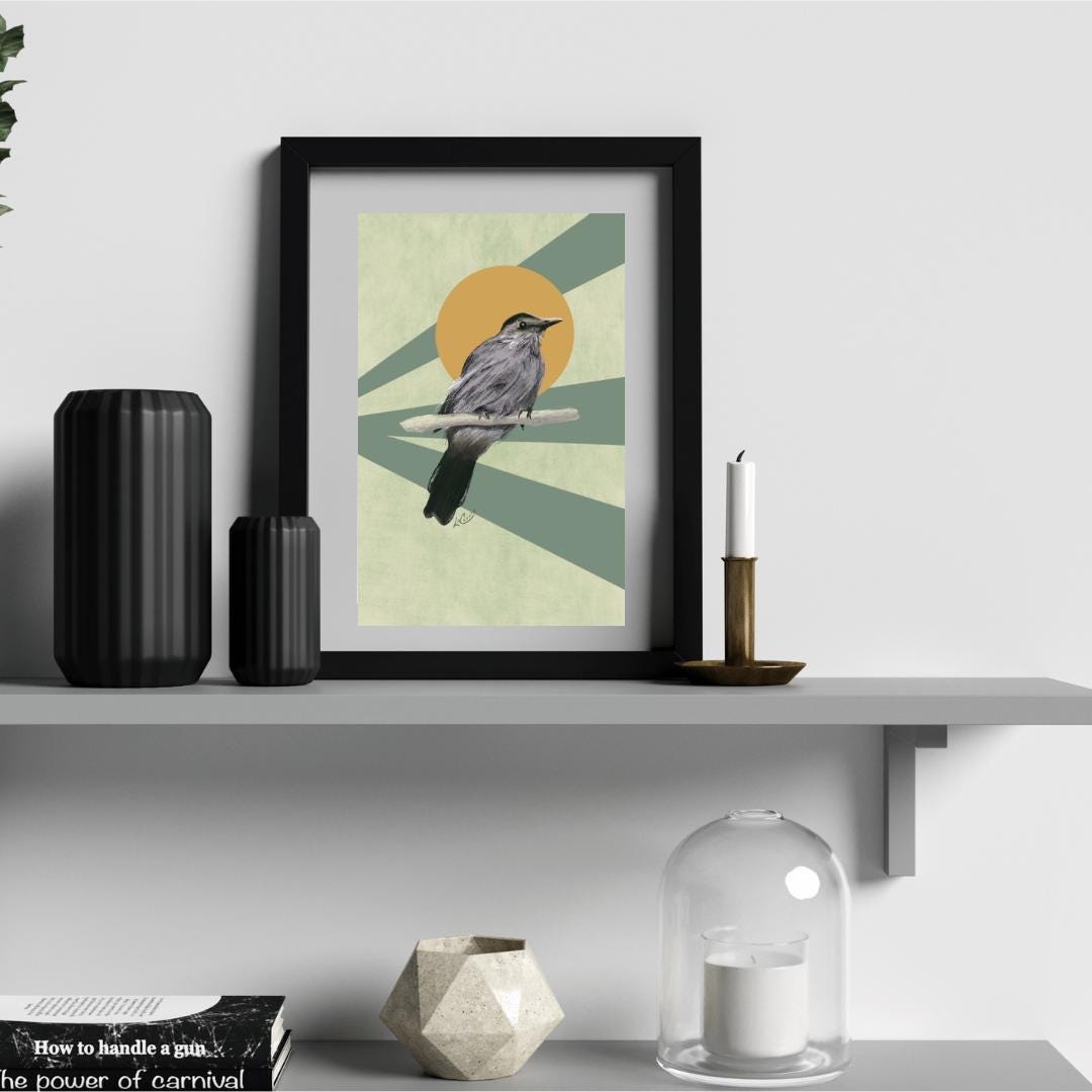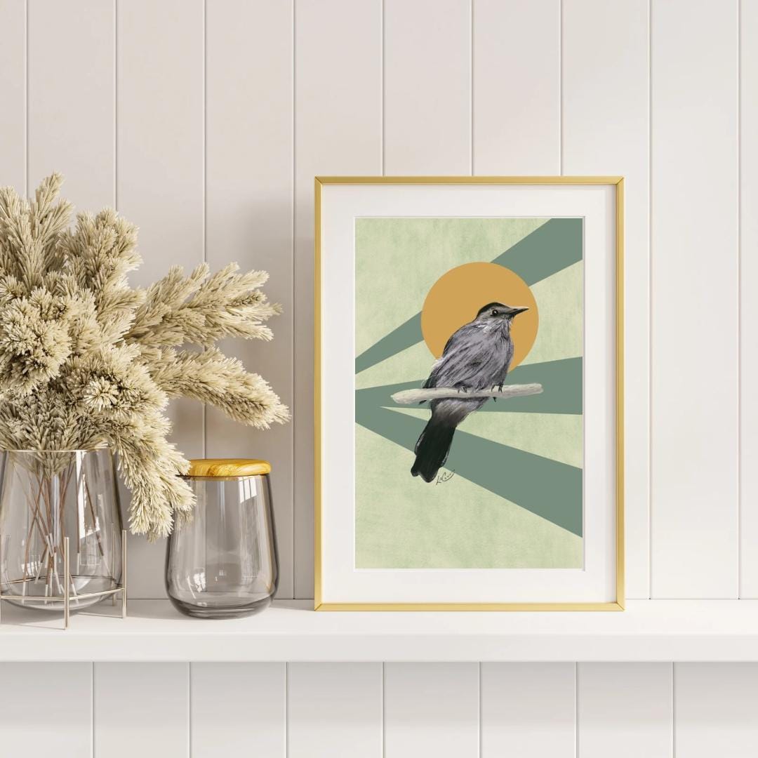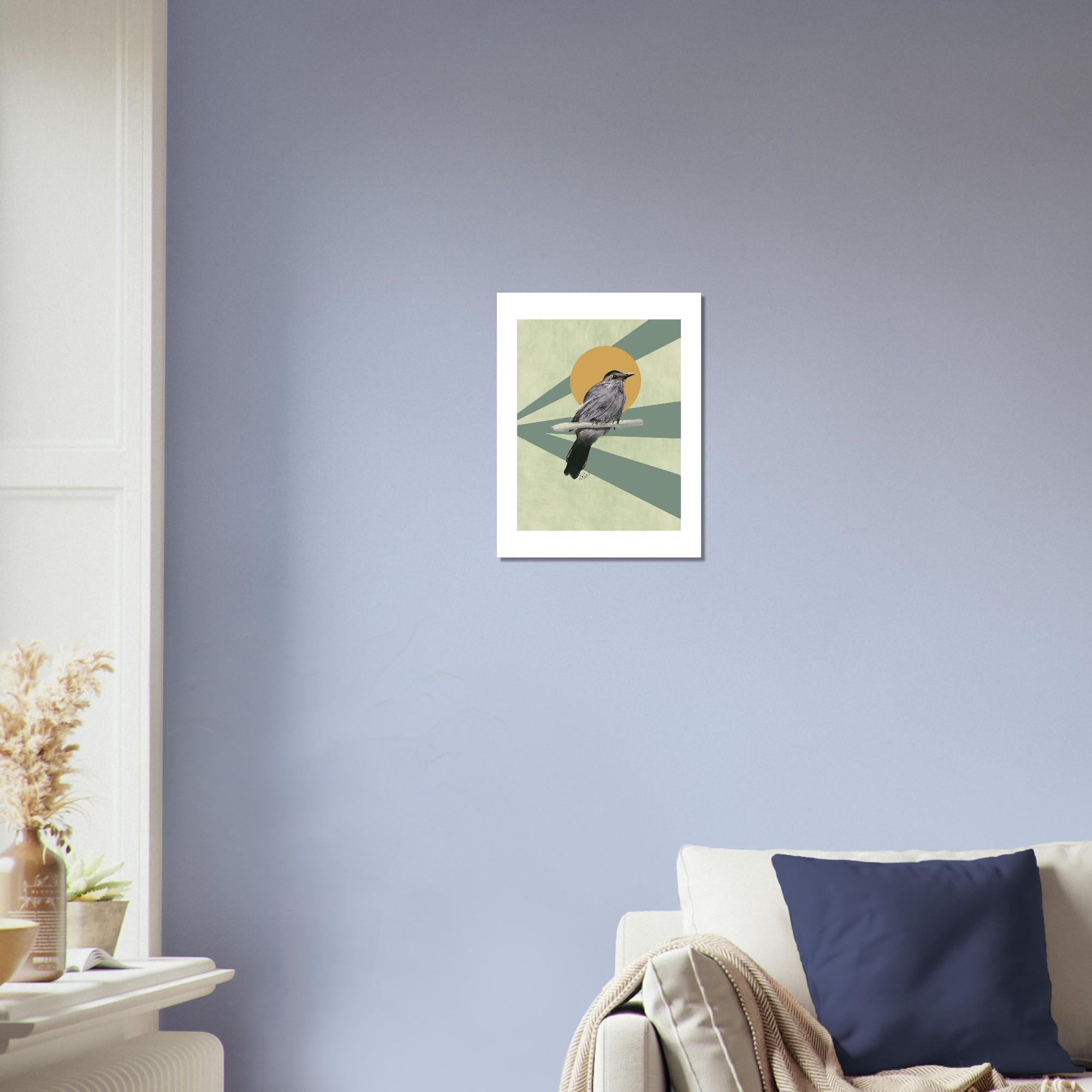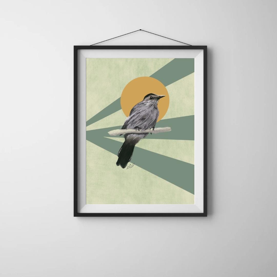 Elevate your space with this unframed print of a majestic Gray Catbird on a stunning green abstract backdrop. The white border adds a clean, modern touch, perfect for fitting into any frame effortlessly. Bring the beauty of nature into your home with this charming piece. Wildly elegant and versatile!