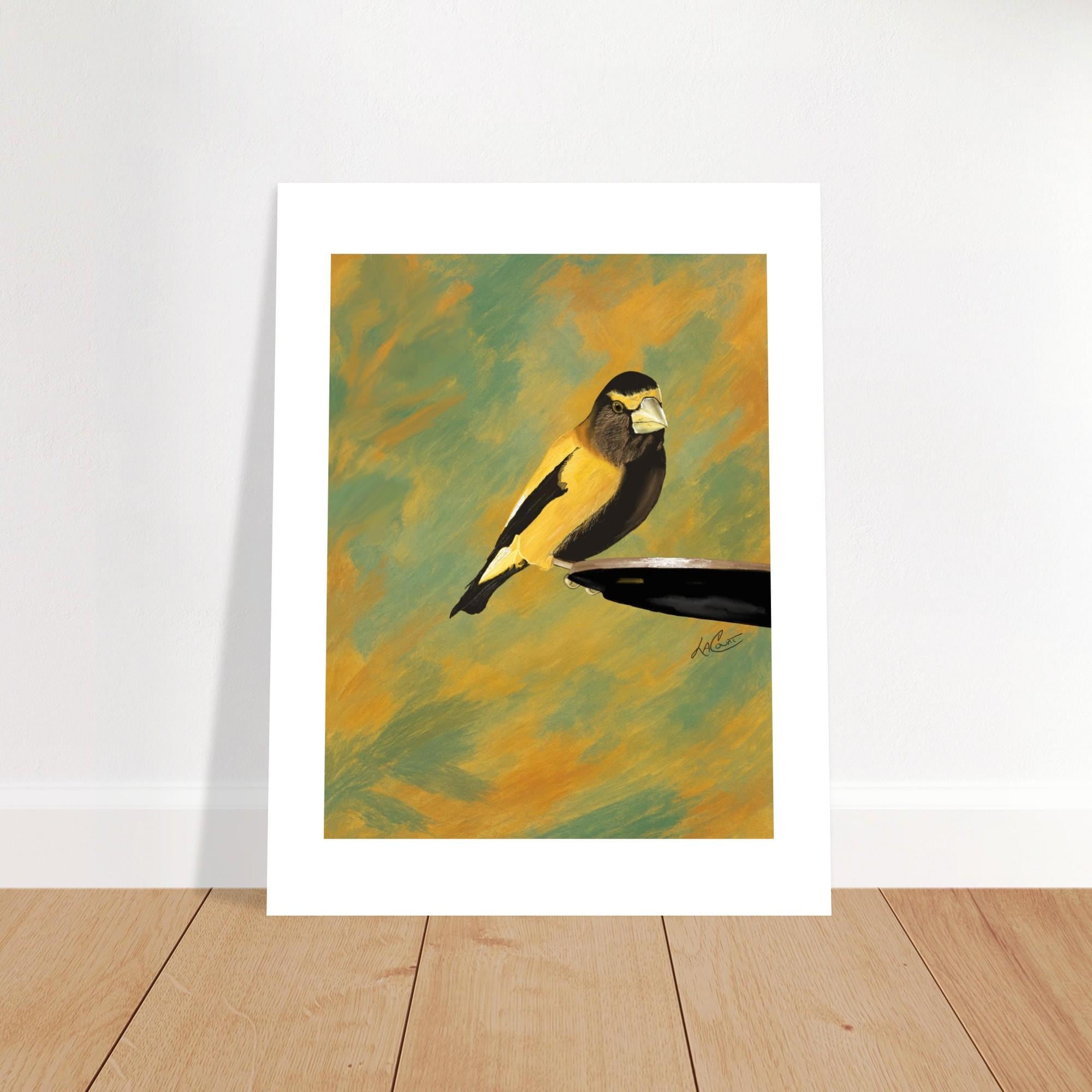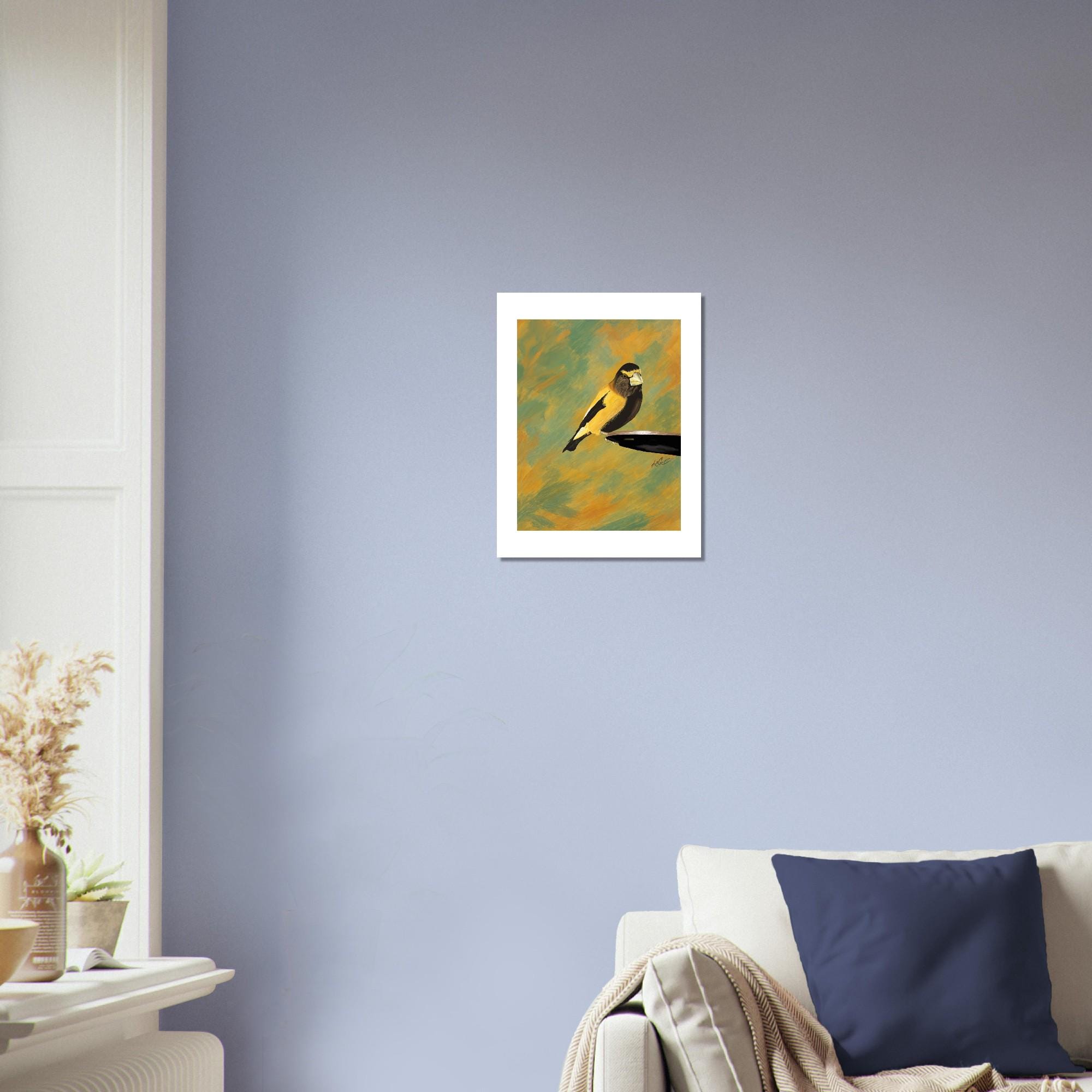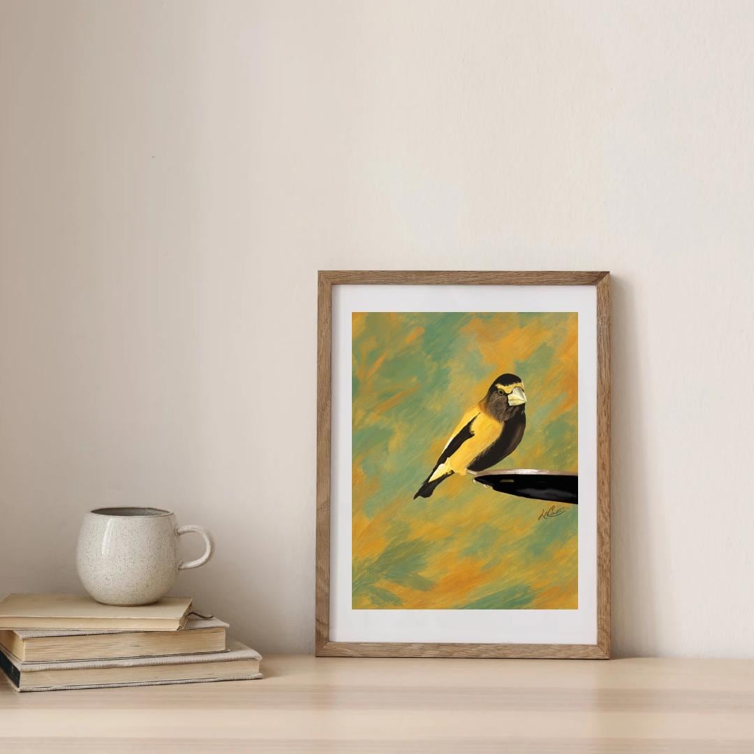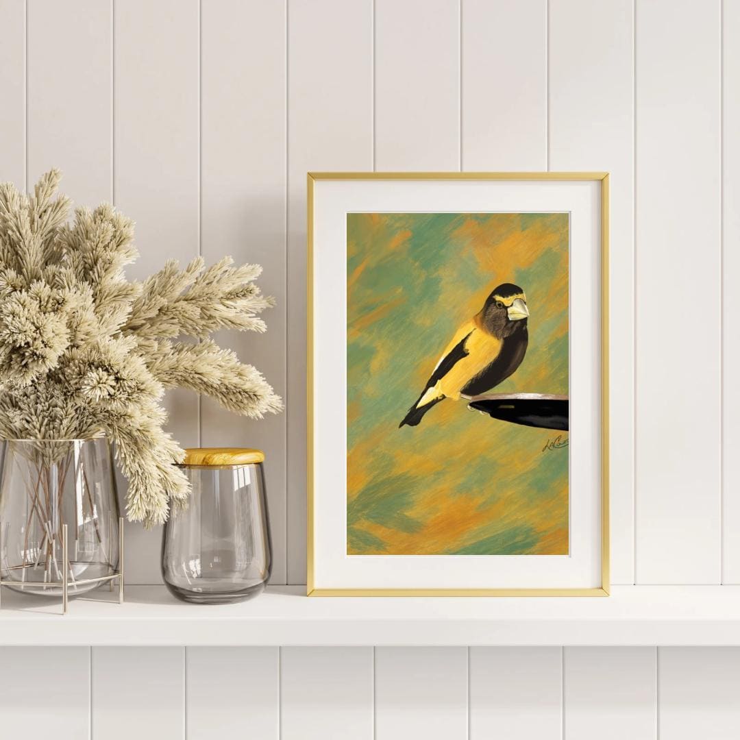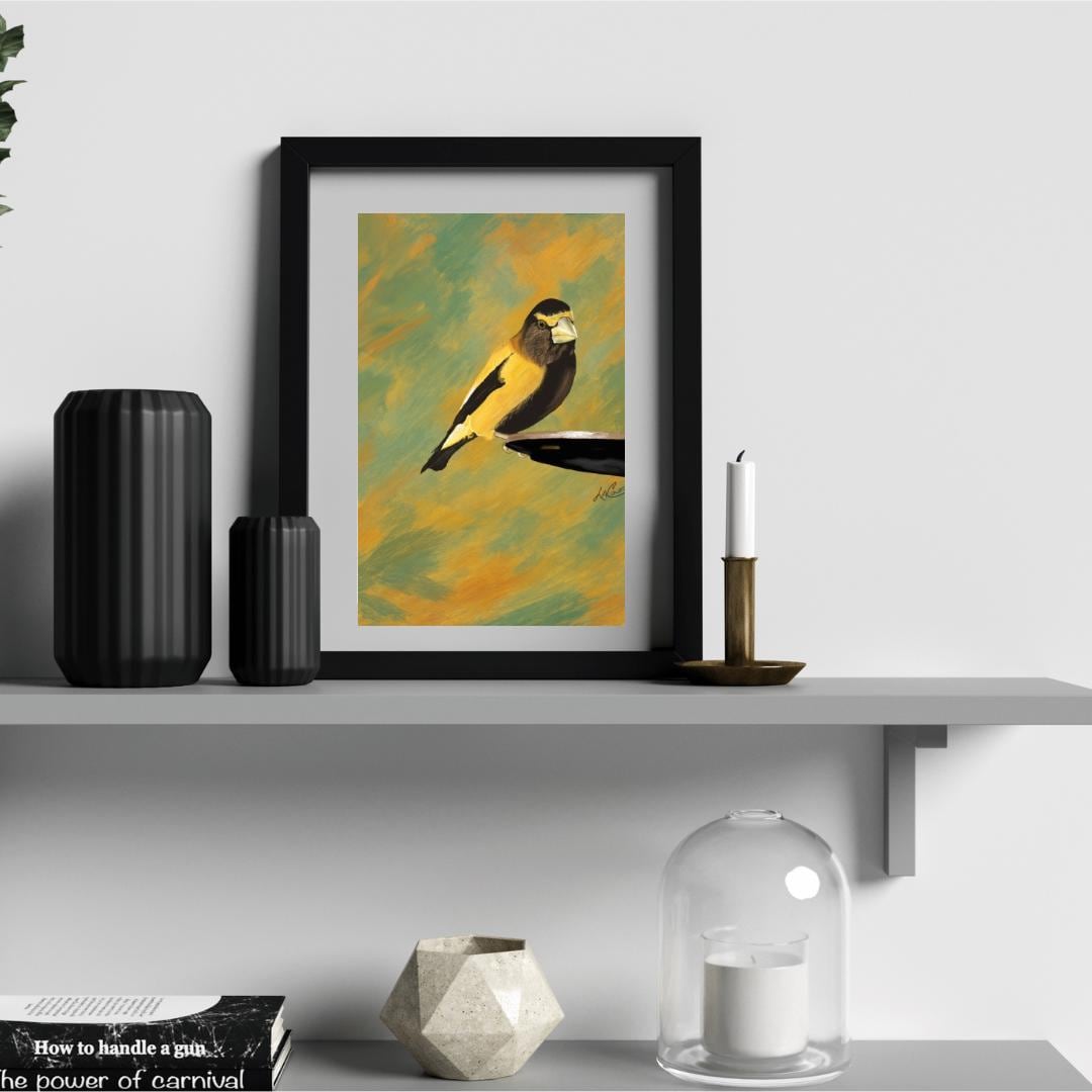 Bring the beauty of nature into your home with this unframed print capturing an Evening Grosbeak. The stunning white border perfectly complements the abstract green background, creating a unique and artistic piece for your space. A must-have for bird lovers and art enthusiasts alike!