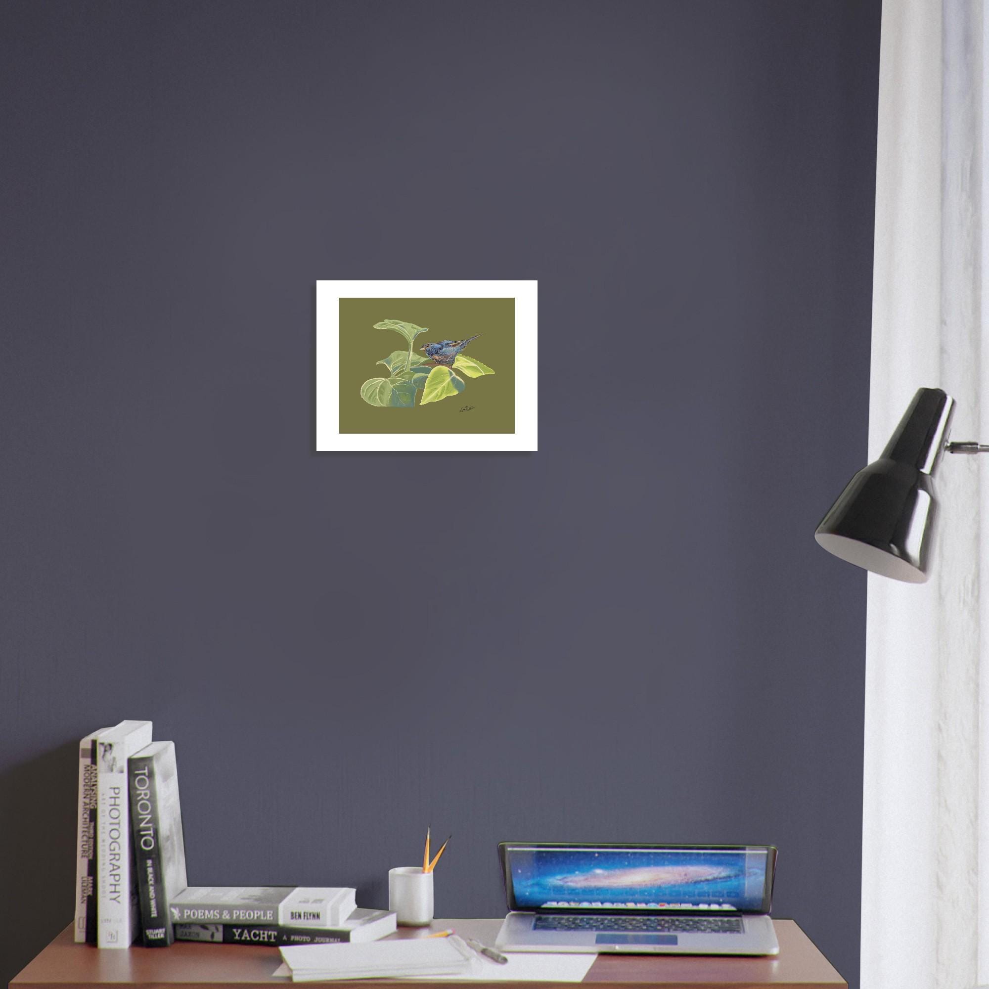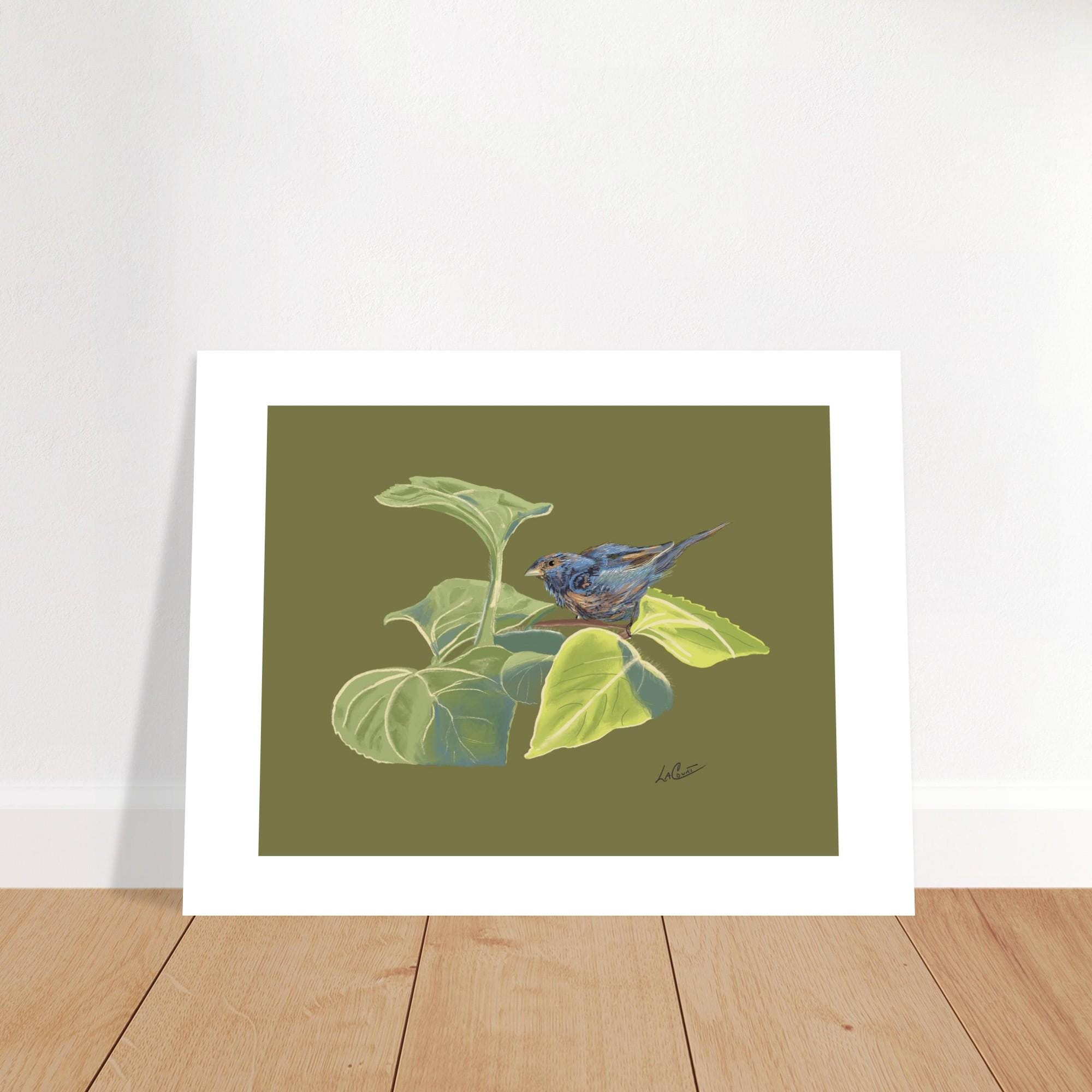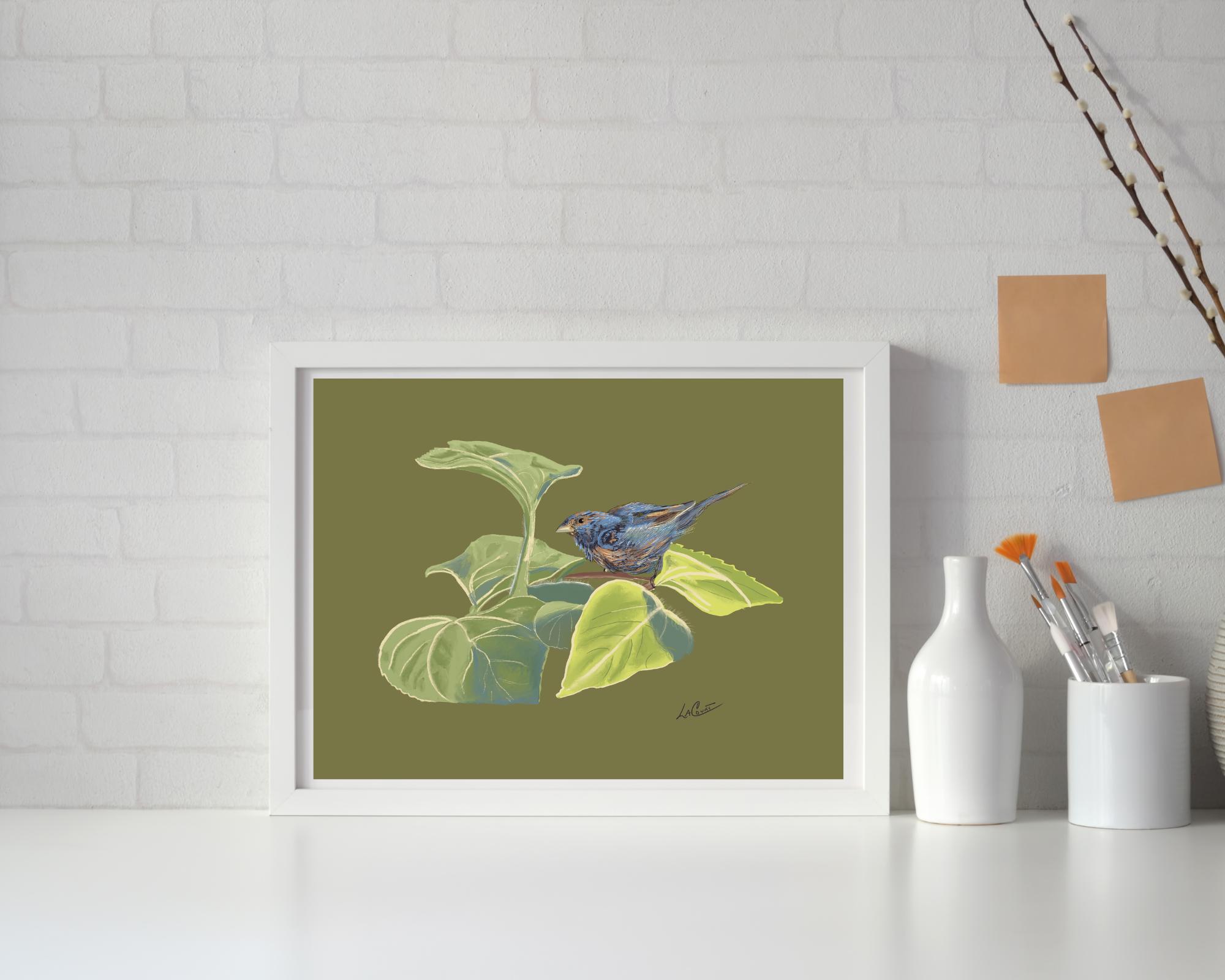 Bring the beauty of nature into your home with this unframed print featuring my painting of the stunning Indigo Bunting bird. Set against a beautiful green background, it is designed to easily fit into a frame with a crisp white border, adding a touch of elegance to any space. A lovely addition to your art collection or a perfect gift for bird enthusiasts.