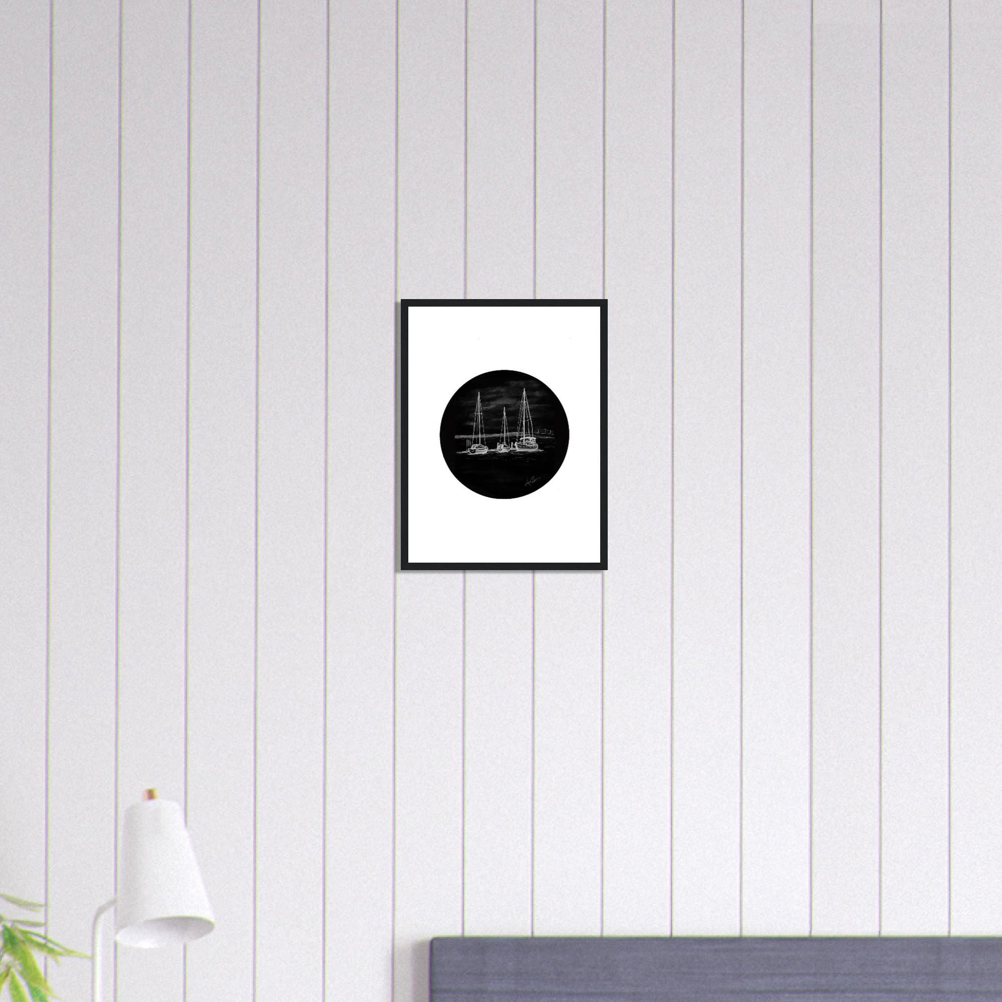 Created using a negative painting technique, this piece glows with contrast — white linework rising from deep black shadows to create a timeless coastal mood. Ideal for anyone who loves the ocean, sailing, or waterfront life.