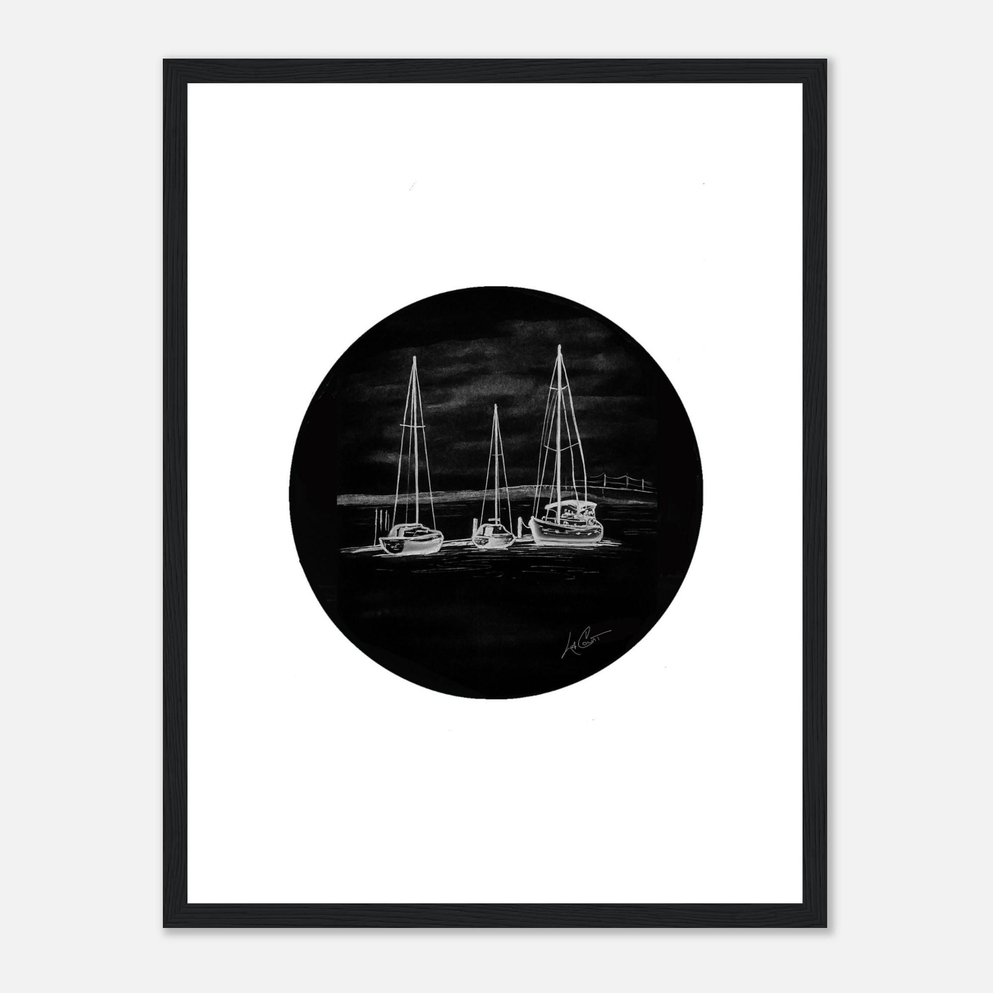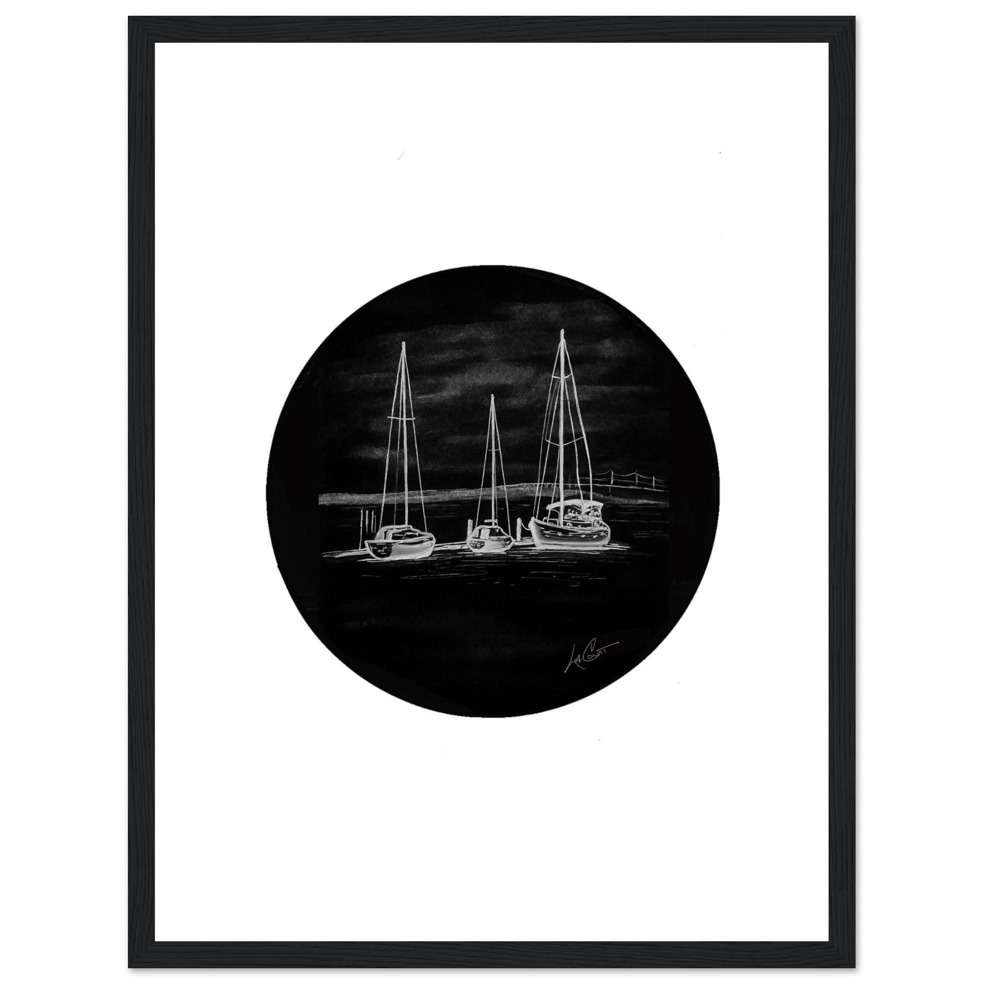 Harbor Calm – Black and White Sailboat Art Print | Nautical Wall Art | Coastal Decor | Night Harbor Drawing by LaCount Anderson