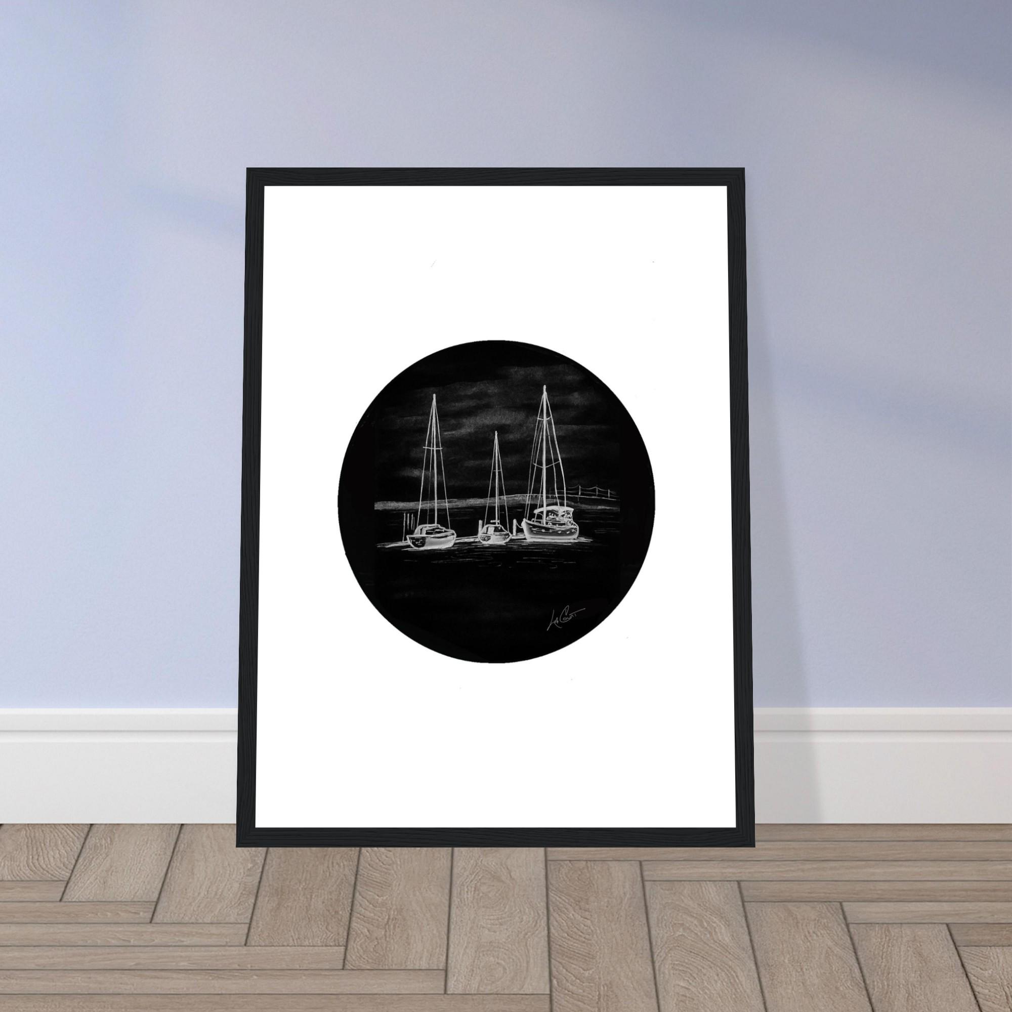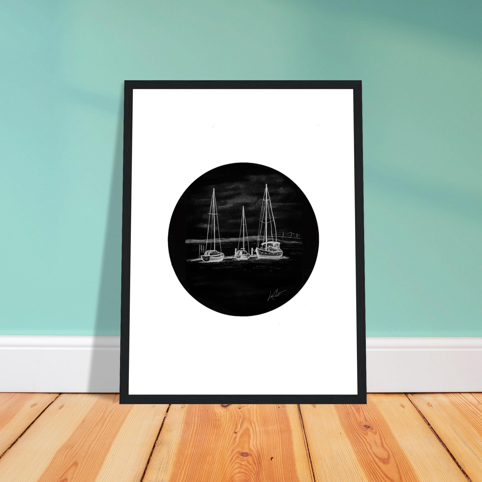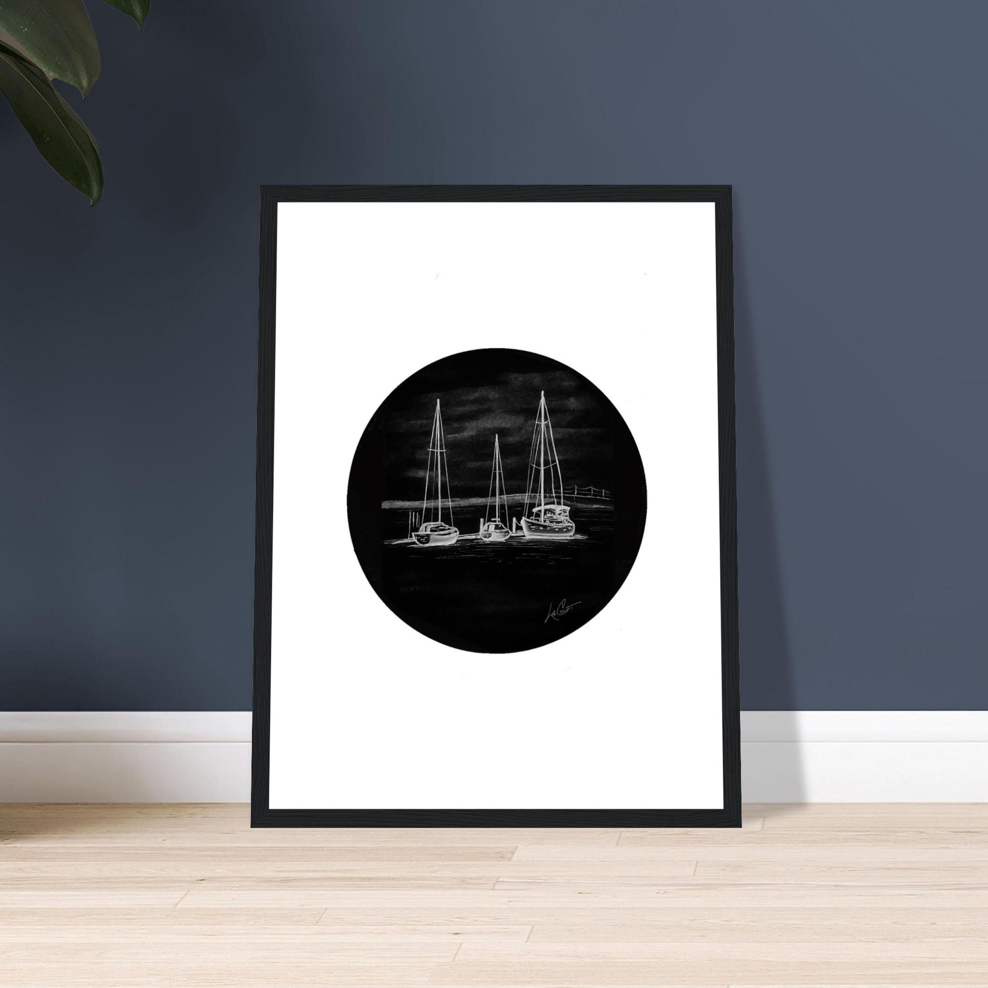 • Black and white nautical artwork featuring sailboats in harbor