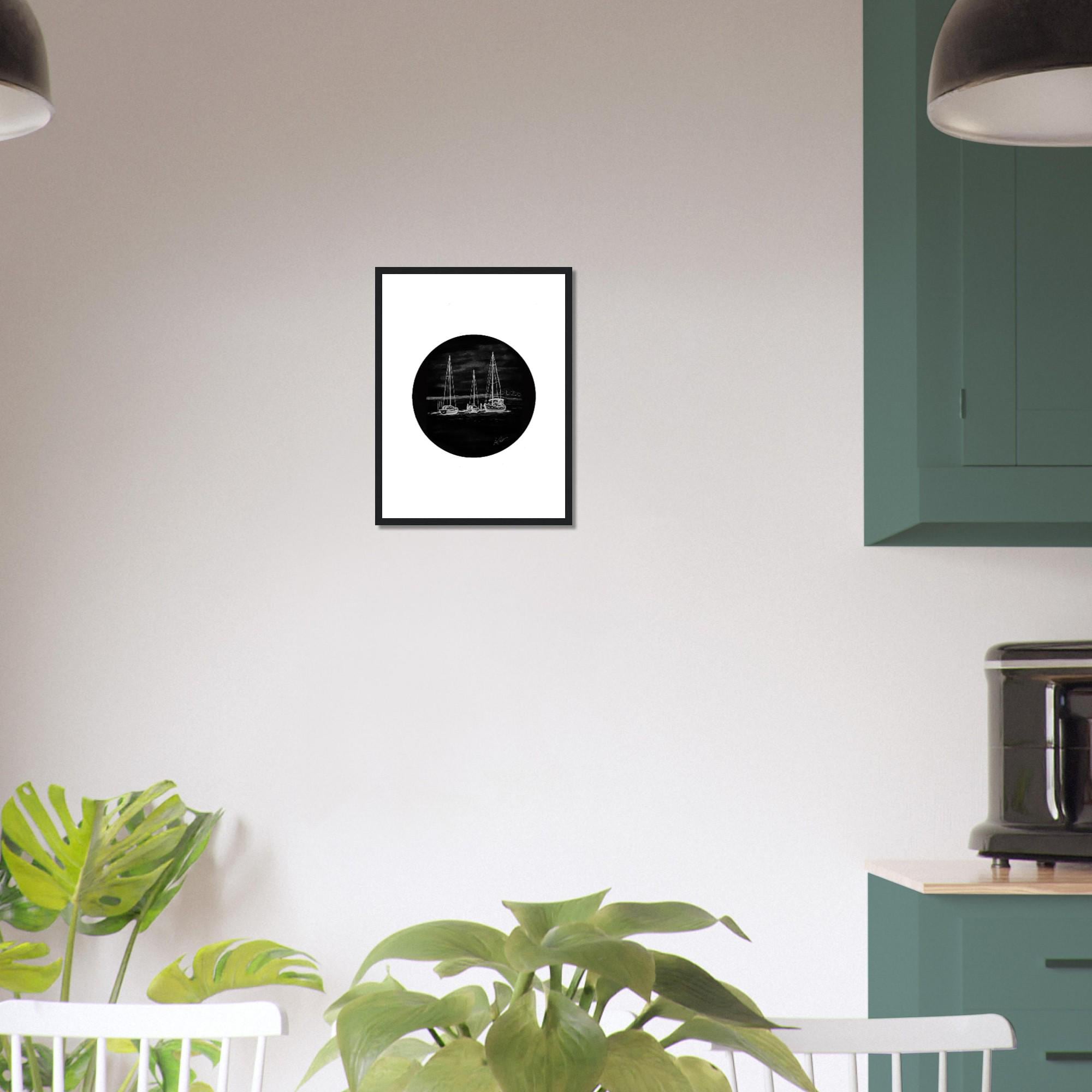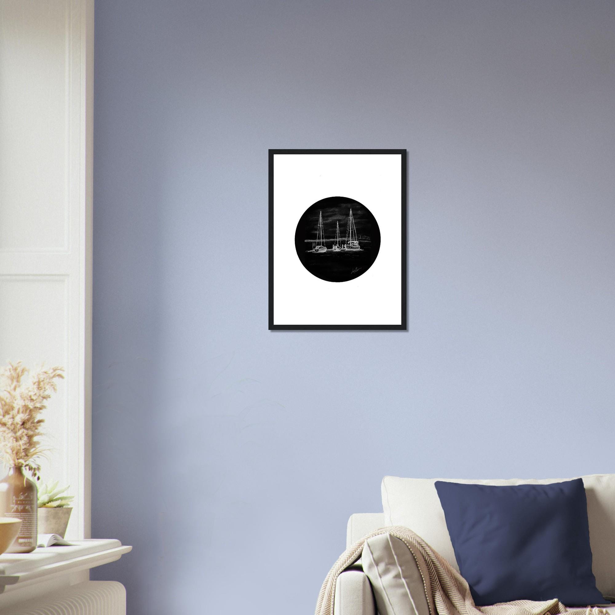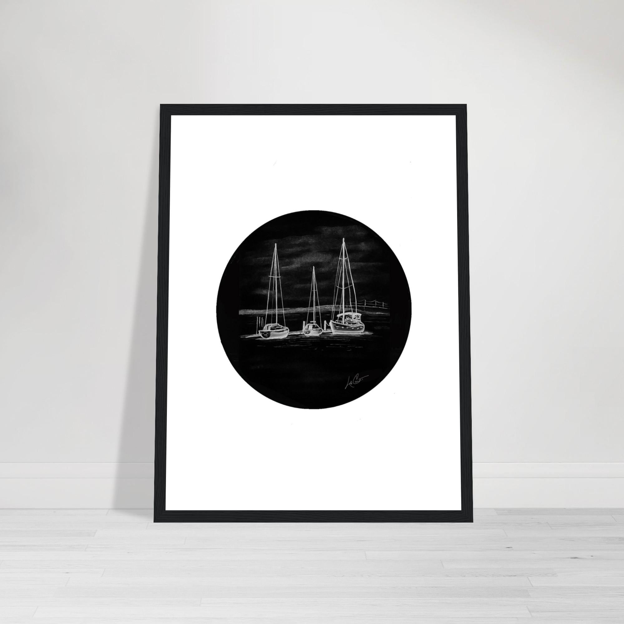 • Black and white nautical artwork featuring sailboats in harbor