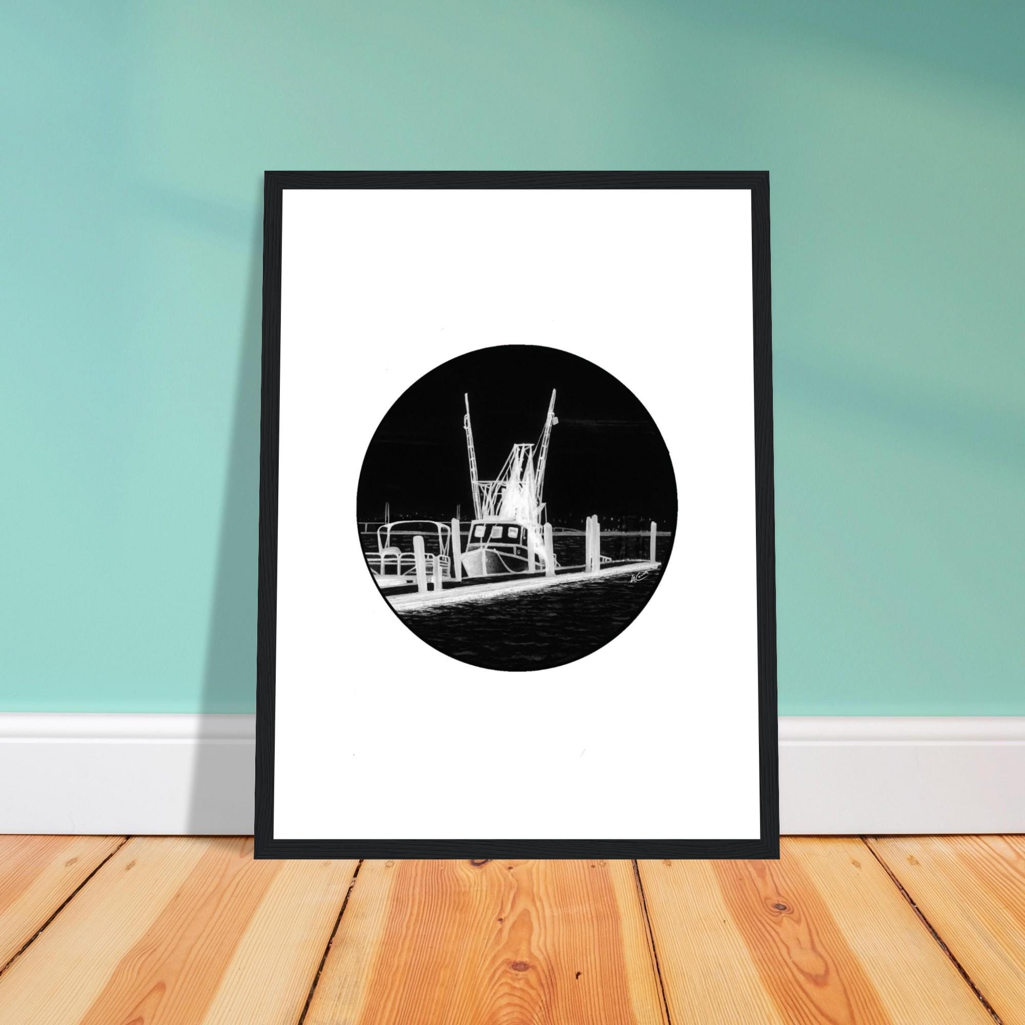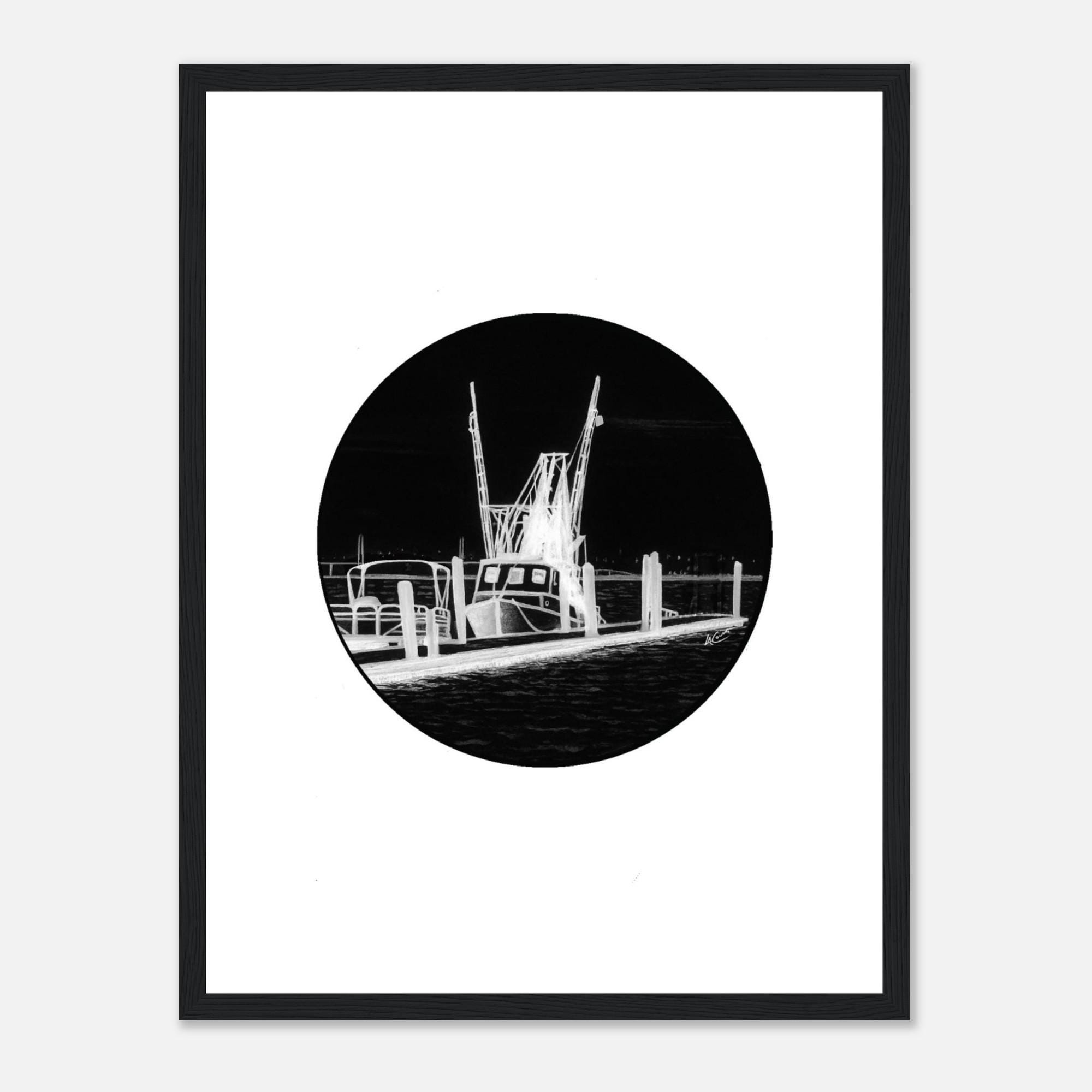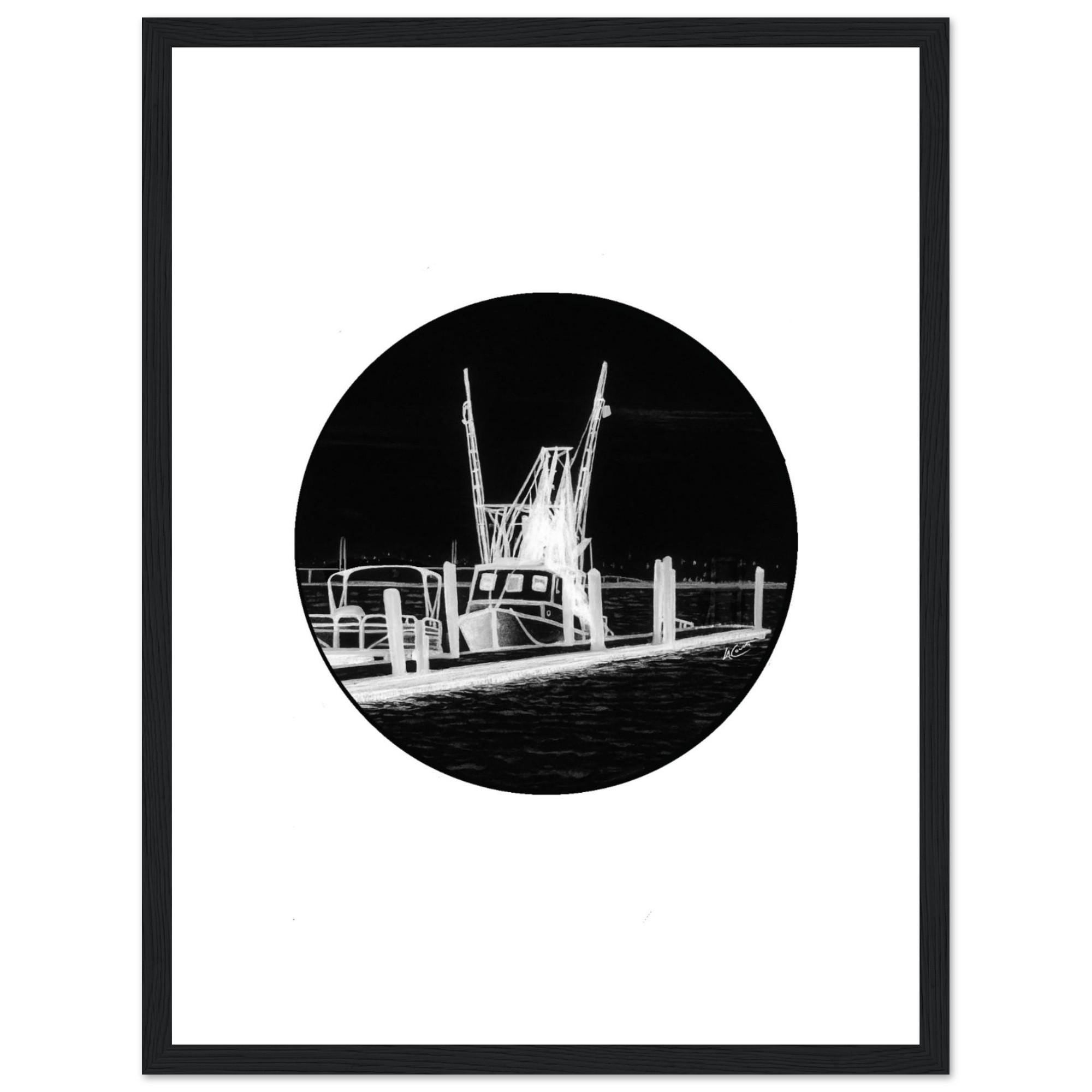 This fine art print captures a fishing boat resting at the dock, rendered in stunning contrast with a unique negative painting technique that makes the whites glow against the deep black background.