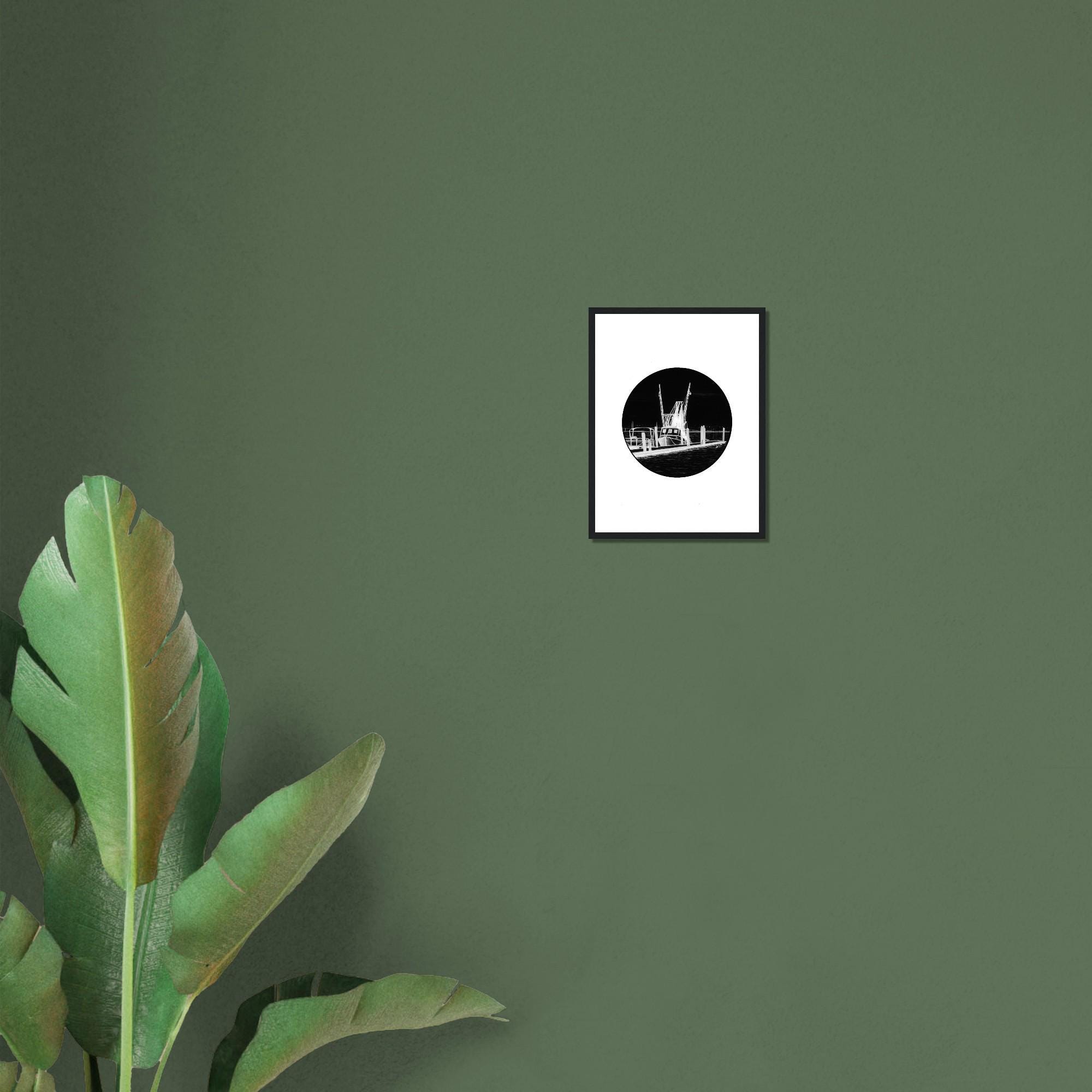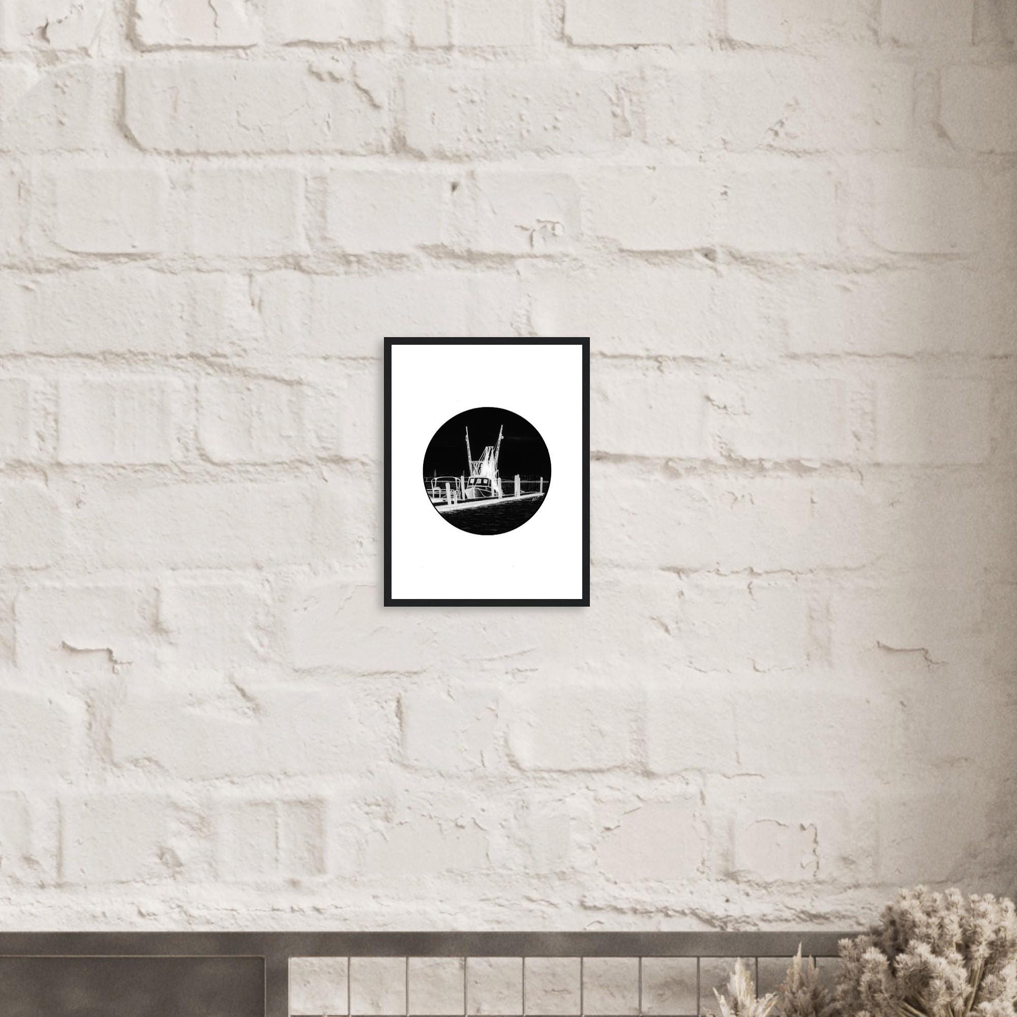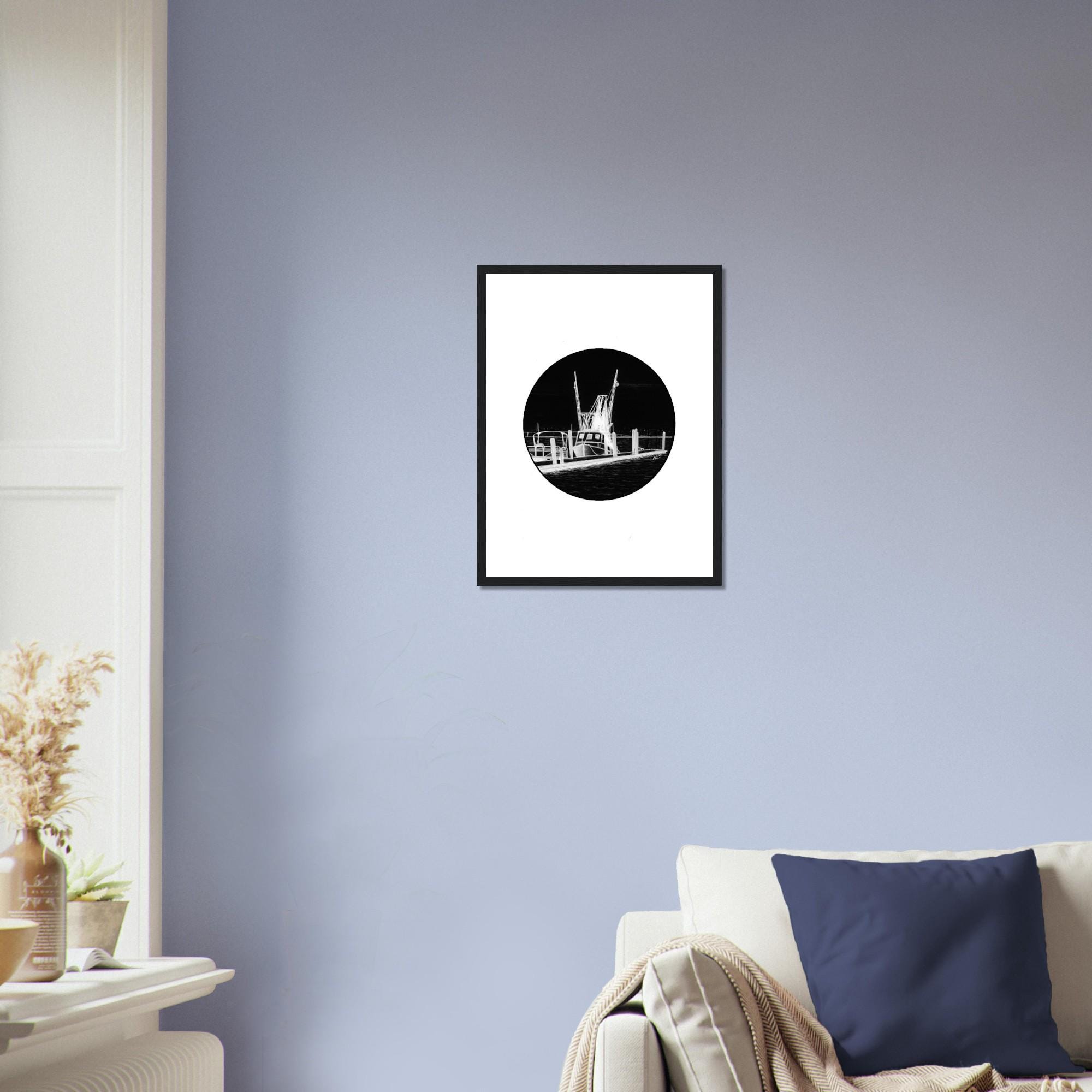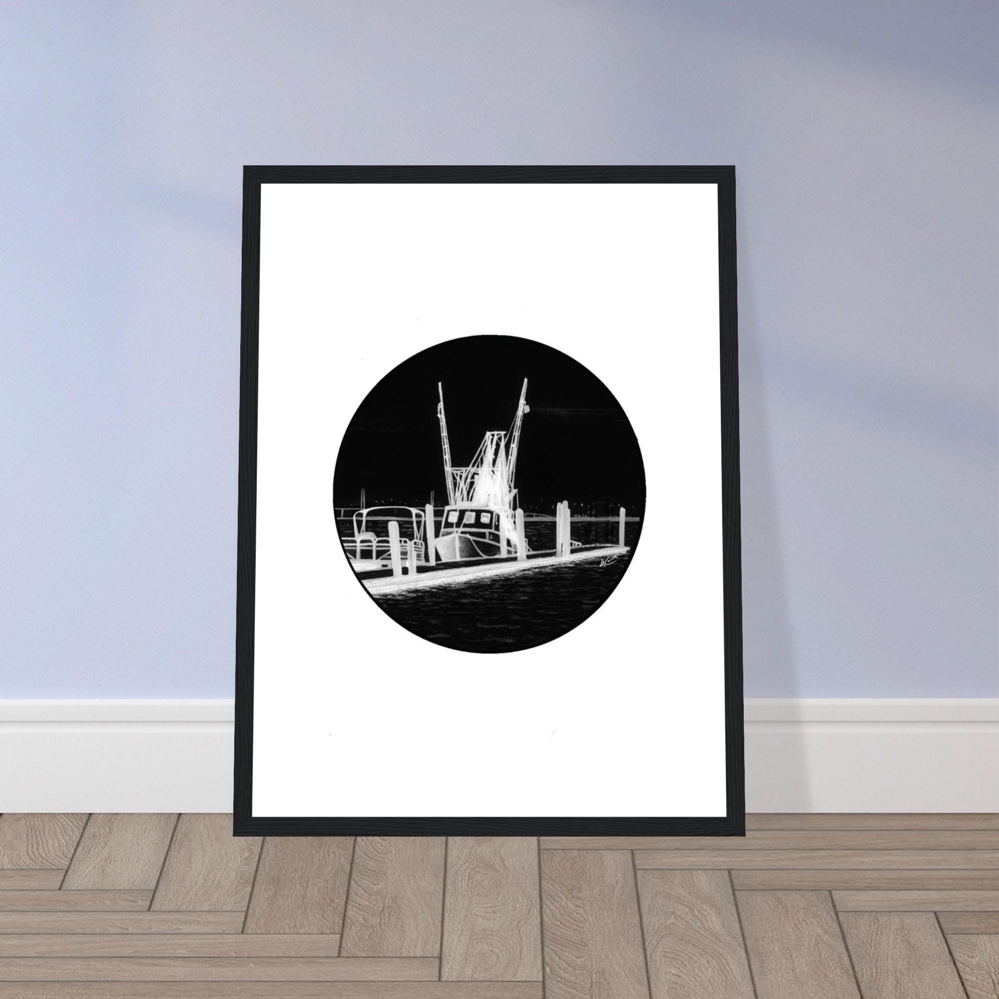 This fine art print captures a fishing boat resting at the dock, rendered in stunning contrast with a unique negative painting technique that makes the whites glow against the deep black background.