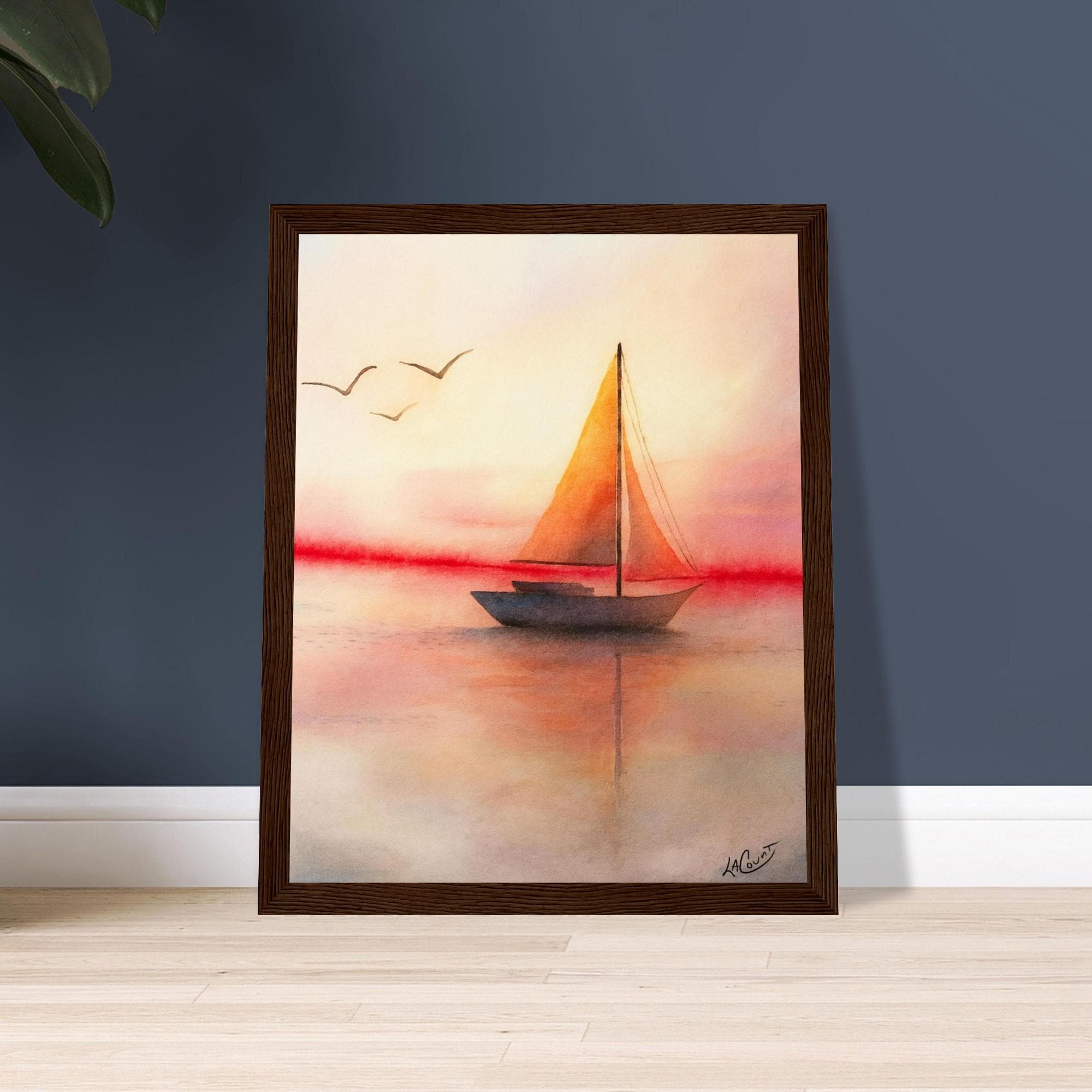 Bring the serene beauty of a sunrise into your home with this stunning sailing wall art featuring a sail boat, beautifully rendered in warm watercolor tones by renowned artist LaCount Anderson. Perfectly suited for beach house wall art, lake houses, or any space where you want to evoke tranquility and nature, this coastal watercolor is a fantastic conversation starter and will surely brighten your walls.