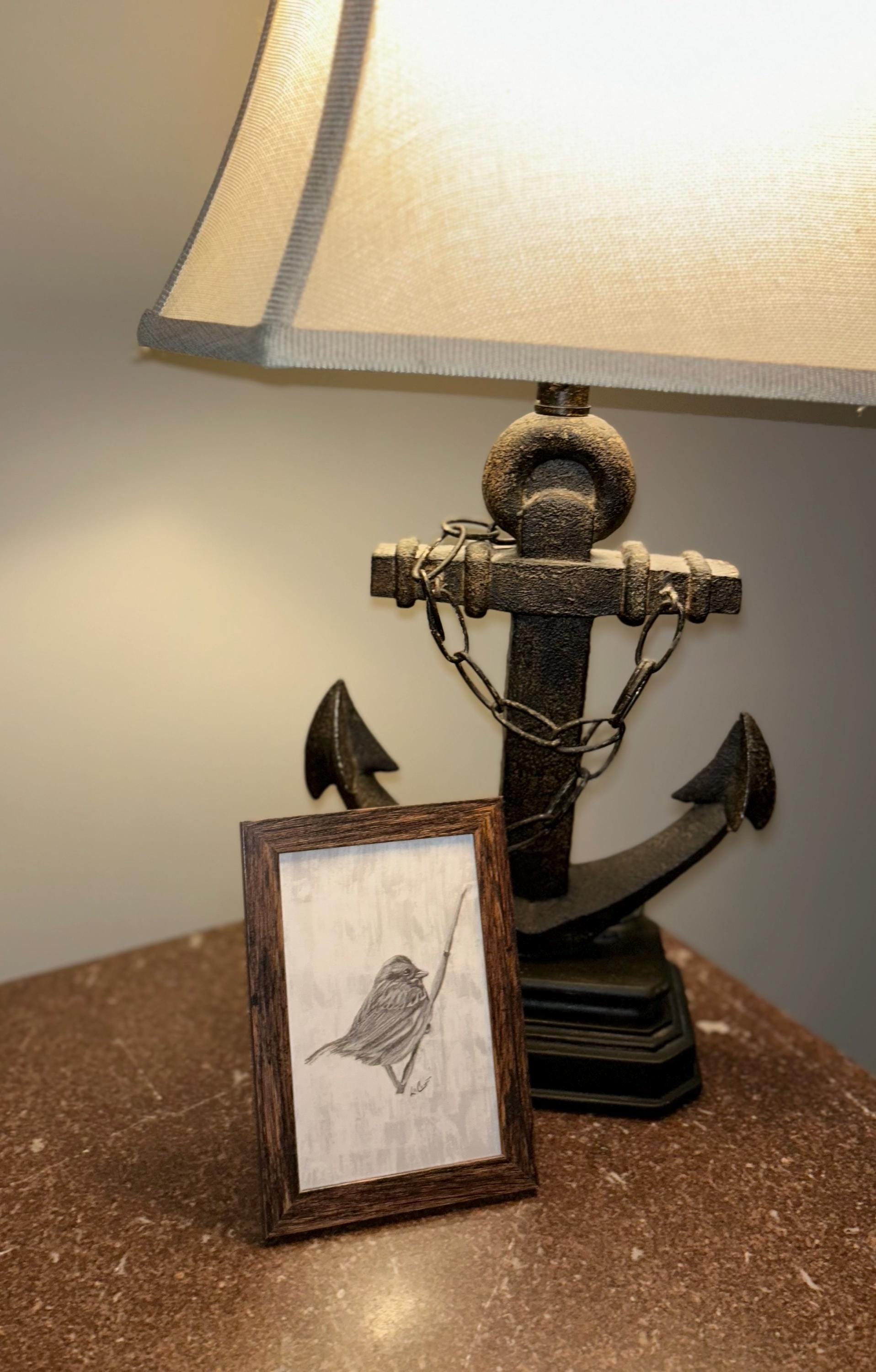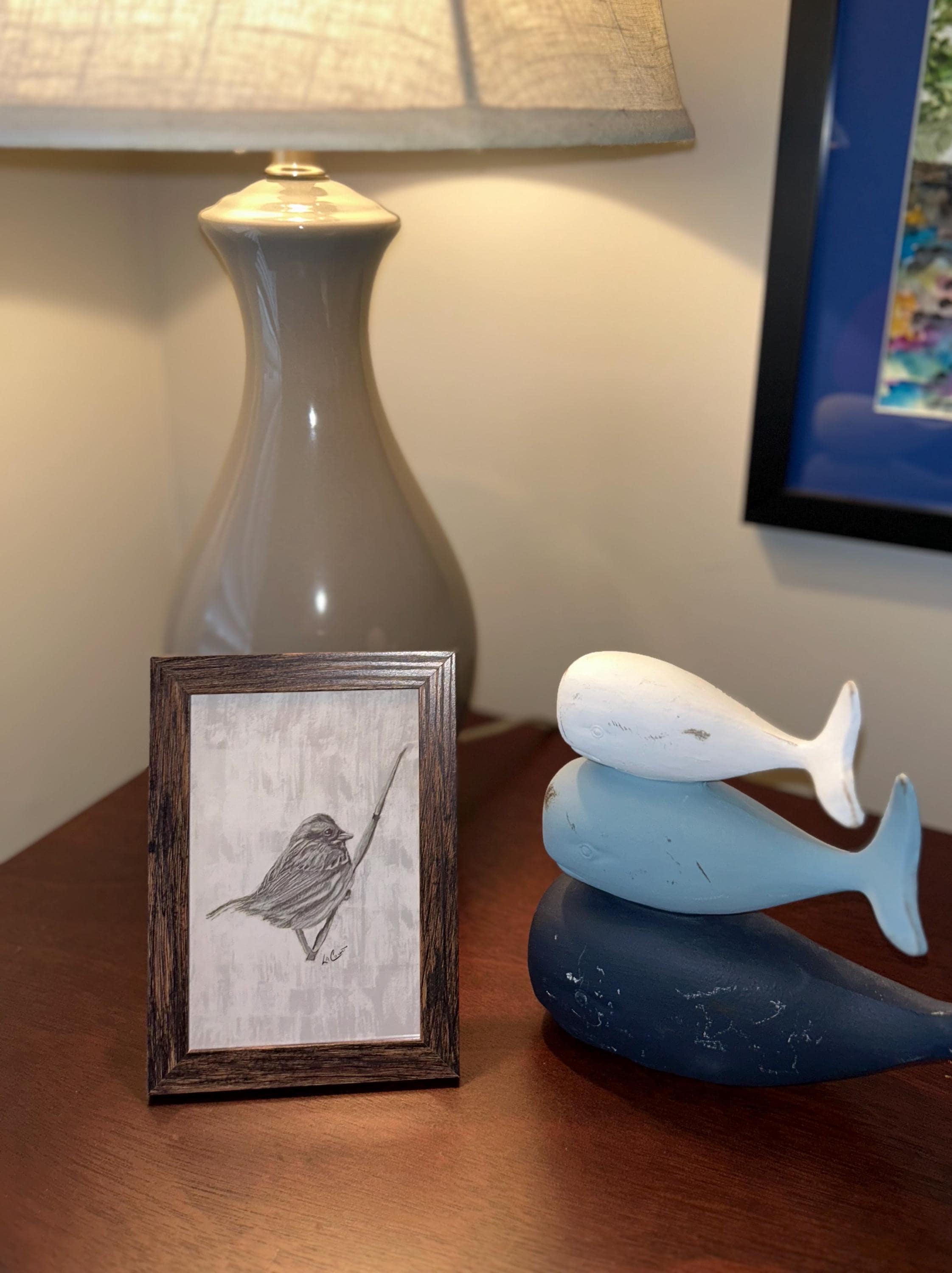 This small artwork features my original bird illustration printed and placed in a natural wooden 4x6 frame. The piece arrives ready to display on a shelf, desk, or wall, making it a perfect gift for bird lovers and nature enthusiasts.